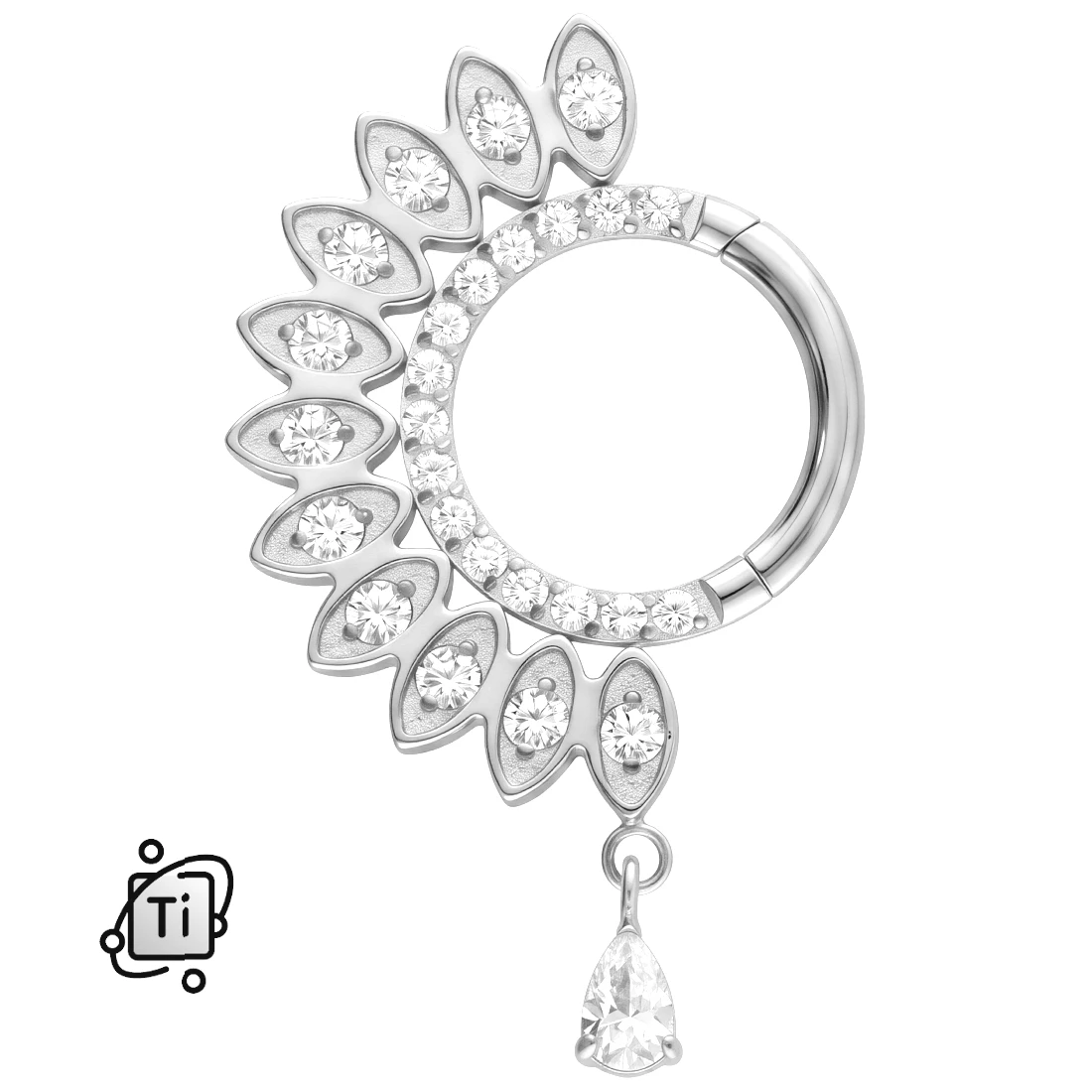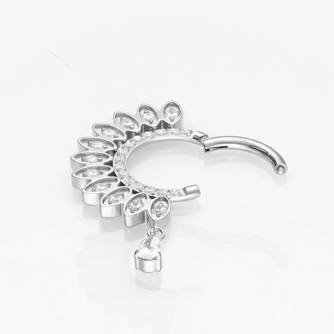 Ten model wyróżnia się bogatą, ażurową konstrukcją i wyraźnym blaskiem licznych kamieni. Ze względu na swoją wielkość i dekoracyjny charakter, będzie odpowiednim wyborem do przekłuć typu daith dla osób poszukujących bardziej widocznej i ozdobnej biżuterii.