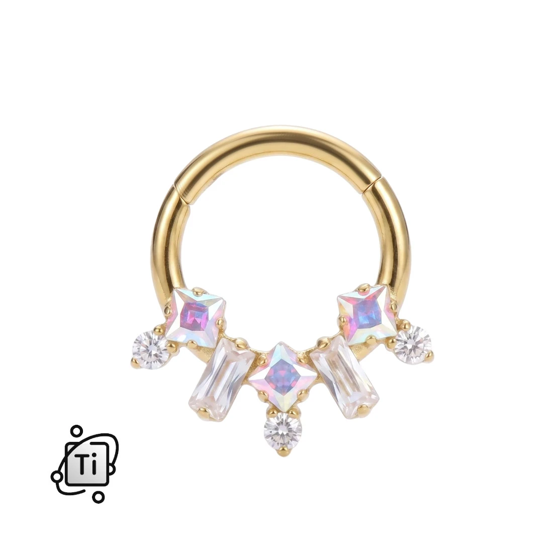 Konstrukcja kółka opiera się na wygodnym zawiasie, który umożliwia sprawne otwieranie i zatrzaskiwanie biżuterii. Dolna część kółka została ozdobiona bogatą kompozycją symetrycznie osadzonych cyrkonii. W samym centrum oraz po bokach znajdują się trzy duże kryształki o szlifie kwadratowym w opalizującym kolorze Aurora Borealis, który mieni się odcieniami błękitu, różu i fioletu. Pomiędzy nimi umieszczono dwa transparentne kryształki o szlifie bagietkowym. Całość uzupełniają trzy drobne, okrągłe, przezroczyste cyrkonie umieszczone na samym dole oraz na zewnętrznych krawędziach zdobienia. Wszystkie kamienie są zakute w tytanowe łapki, co gwarantuje ich stabilność.