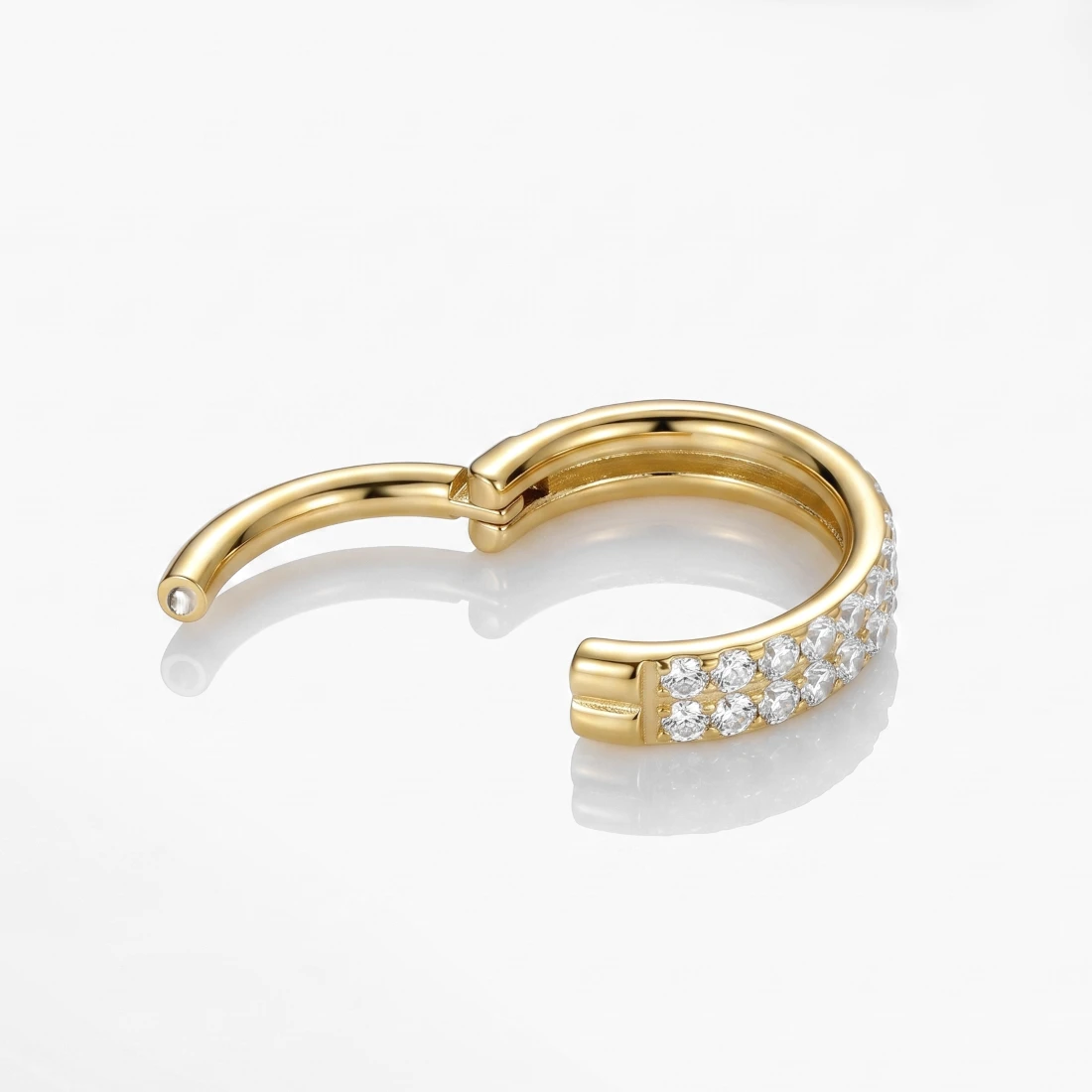 Konstrukcja kolczyka opiera się na wygodnym zapięciu typu clicker, które umożliwia łatwe otwieranie i zamykanie biżuterii za pomocą ruchomego segmentu na zawiasie. Przednia część obręczy została ozdobiona dwoma równoległymi rzędami transparentnych cyrkonii, które są osadzone blisko siebie, tworząc gęstą i lśniącą strukturę. Każdy kamień jest zakuty w stalowe łapki, co minimalizuje ryzyko jego wypadnięcia. Wnętrze kółka oraz jego krawędzie są starannie wypolerowane na wysoki połysk, co zapewnia komfort noszenia i gładkość kontaktu z ciałem.