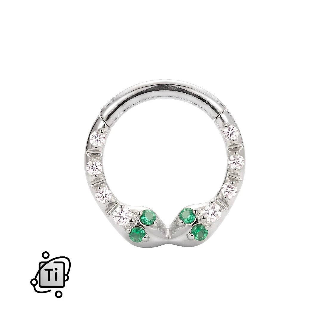 Konstrukcja kolczyka opiera się na okrągłym profilu wyposażonym w wygodne zapięcie typu clicker, które pozwala na łatwe założenie ozdoby. Dolna, ozdobna część obręczy przedstawia dwie symetrycznie zwrócone ku sobie żmijki wysadzane przeźroczystymi cyrkoniami. Każda ze żmijek posiada oczy wykonane z intensywnie zielonych kryształków.