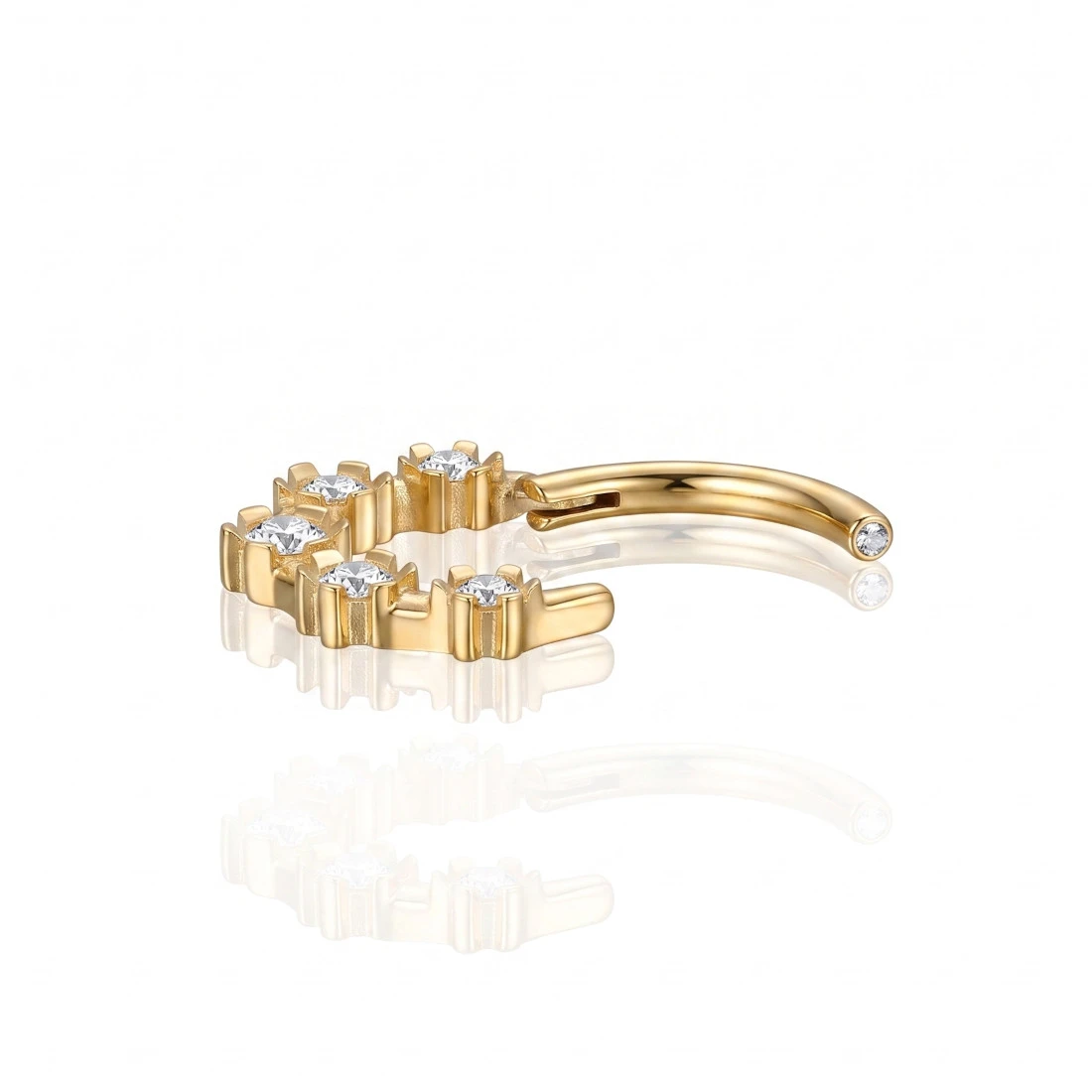 Okrągły kolczyk zamykany odcinkiem kółka umocowanym na delikatnym zawiasie. Wykonany z Tytanu G23, materiału w pełni biokompatybilnego, który nie zawiera niklu, nie uczula i może być stosowany nawet w świeżych lub problematycznych przekłuciach. Złota powłoka nanoszona metodą PVD charakteryzuje się wysoką odpornością na ścieranie, zarysowania oraz działanie czynników zewnętrznych, dzięki czemu kolczyk zachowuje swój intensywny kolor i połysk przez długi czas użytkowania.