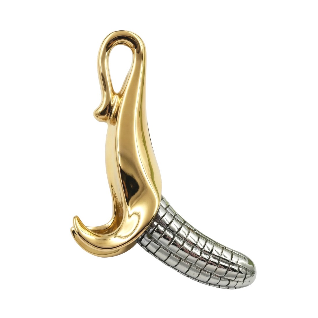 Zawieszka przedstawia owoc banana w trakcie obierania. Zewnętrzna skórka posiada gładką, polerowaną powierzchnię w kolorze żółtego złota, która tworzy efekt lustrzanego blasku. Wnętrze owocu ma kolor srebrny i zostało wykończone wyraźną, regularną fakturą imitującą segmenty. Górna część skórki formuje się w szeroką, zintegrowaną pętlę, która pełni rolę kaucji do zawieszenia na łańcuszku. Precyzyjne połączenie dwóch kolorów i różnych struktur nadaje przedmiotowi trójwymiarowy charakter.Zawieszka realistycznie przedstawia owoc banana wykonanego w dwóch kontrastujących kolorach: srebrnym i złotym. Dolna, srebrna część posiada teksturę przypominającą obrany owoc, z pionowymi żłobieniami. W kontraście do teksturowanej srebrnej części, złota, z której wykonana jest skórka banana jest głada i błyszcząca.