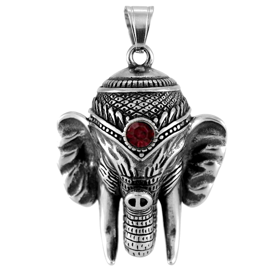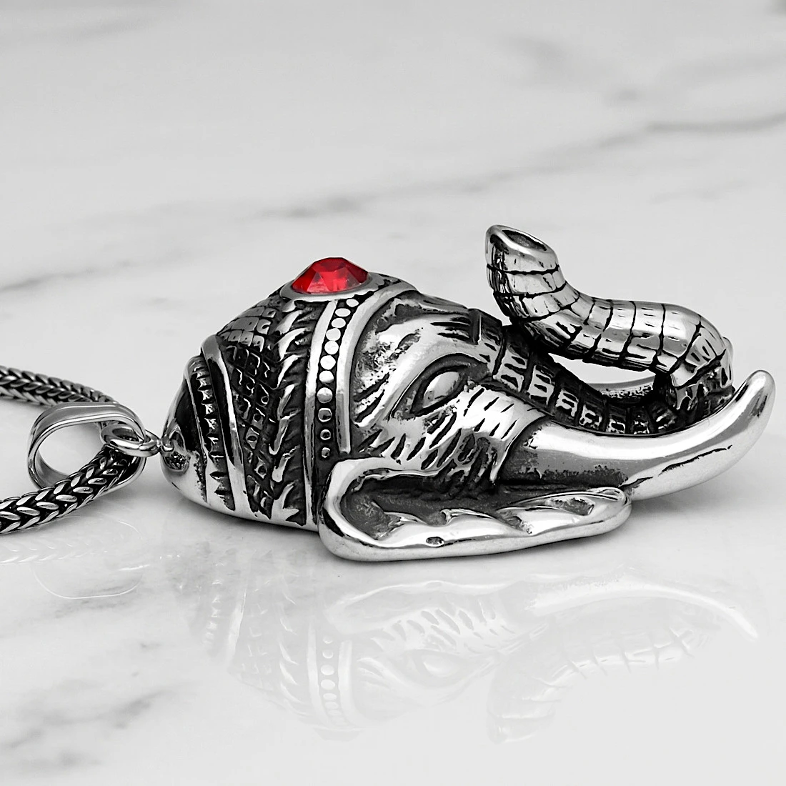 Produkt przedstawia głowę słonia z bogatymi zdobieniami o charakterze orientalnym. Centralnym punktem kompozycji jest czerwona cyrkonia o fasetowym szlifie, umieszczony w ozdobnej oprawie na czole zwierzęcia. Detale takie jak faktura skóry na uszach i trąbie, ciosy oraz geometryczne wzory na nakryciu głowy zostały wykonane z dużą precyzją. Górna część zawieszki posiada solidne ucho, które umożliwia swobodne zawieszenie na łańcuchu o klasycznym lub grubszym splocie.