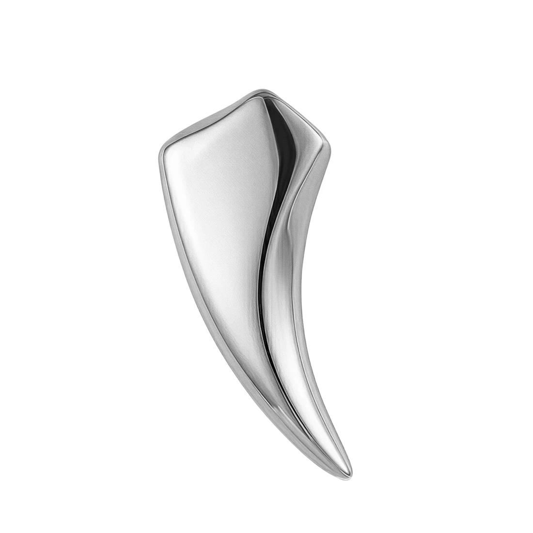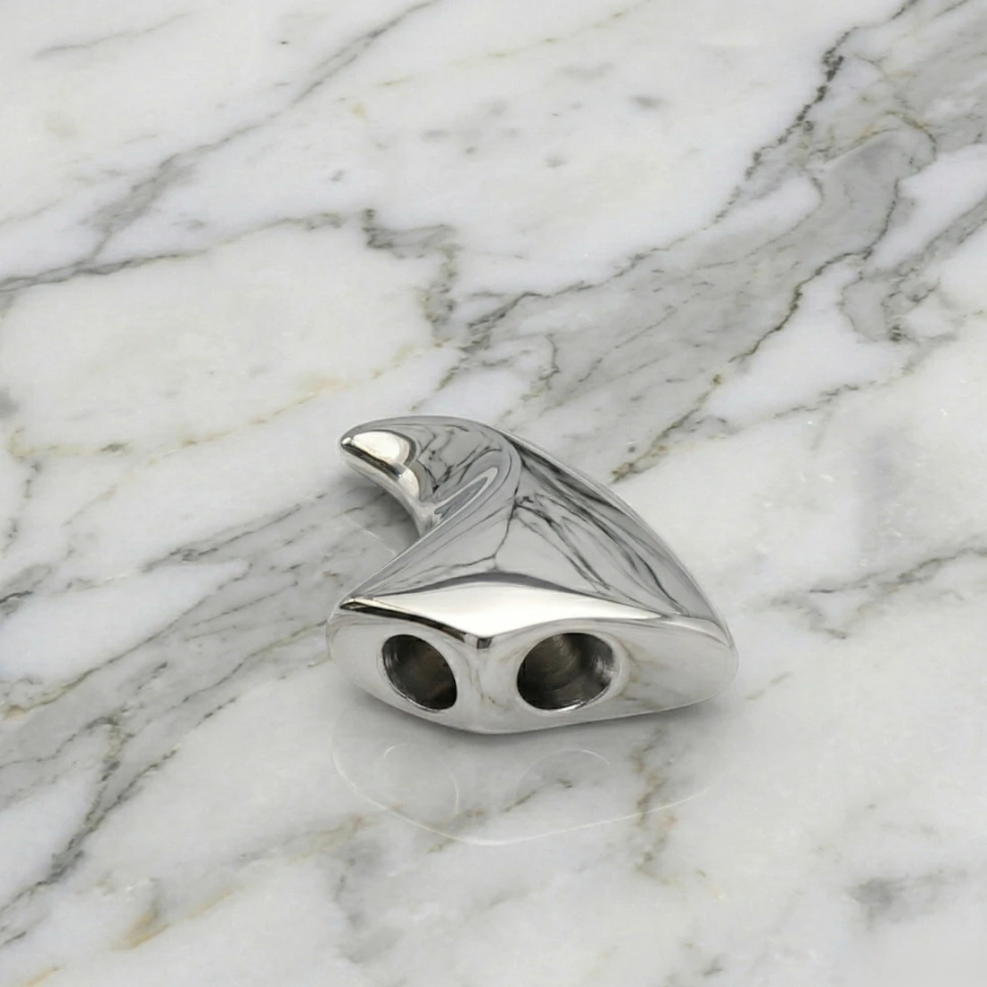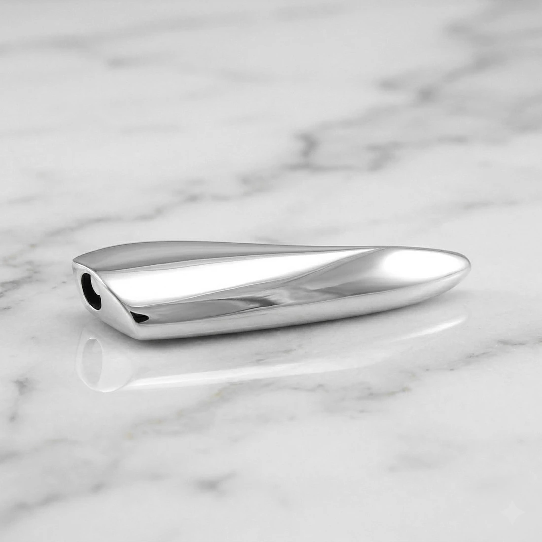Forma zawieszki ma organiczny, asymetryczny kształt, zwężający się ku dołowi, ze spłaszczoną górną częścią. U góry, w bocznej ściance, znajduje się precyzyjny otwór przelotowy, który umożliwia łatwe nawleczenie łańcuszka lub rzemienia. Cała powierzchnia zawieszki została wypolerowana na wysoki połysk, co daje gładką, lustrzaną płaszczyznę i efektowny blask.