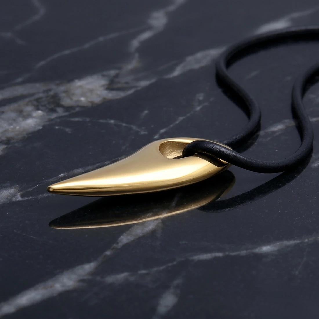 Zawieszka o kształcie inspirowanym organiczną formą kła wykonana z wysokiej jakości stali chirurgicznej 316L. Materiał ten charakteryzuje się wyjątkową trwałością, odpornością na zarysowania oraz właściwościami hipoalergicznymi. Złoty kolor uzyskano dzięki zastosowaniu zaawansowanej metody PVD. Jest to technika napylania próżniowego, która zapewnia powłoce wysoką twardość i odporność na ścieranie, dzięki czemu barwa pozostaje intensywna przez długi czas użytkowania, nie łuszczy się i nie czernieje.