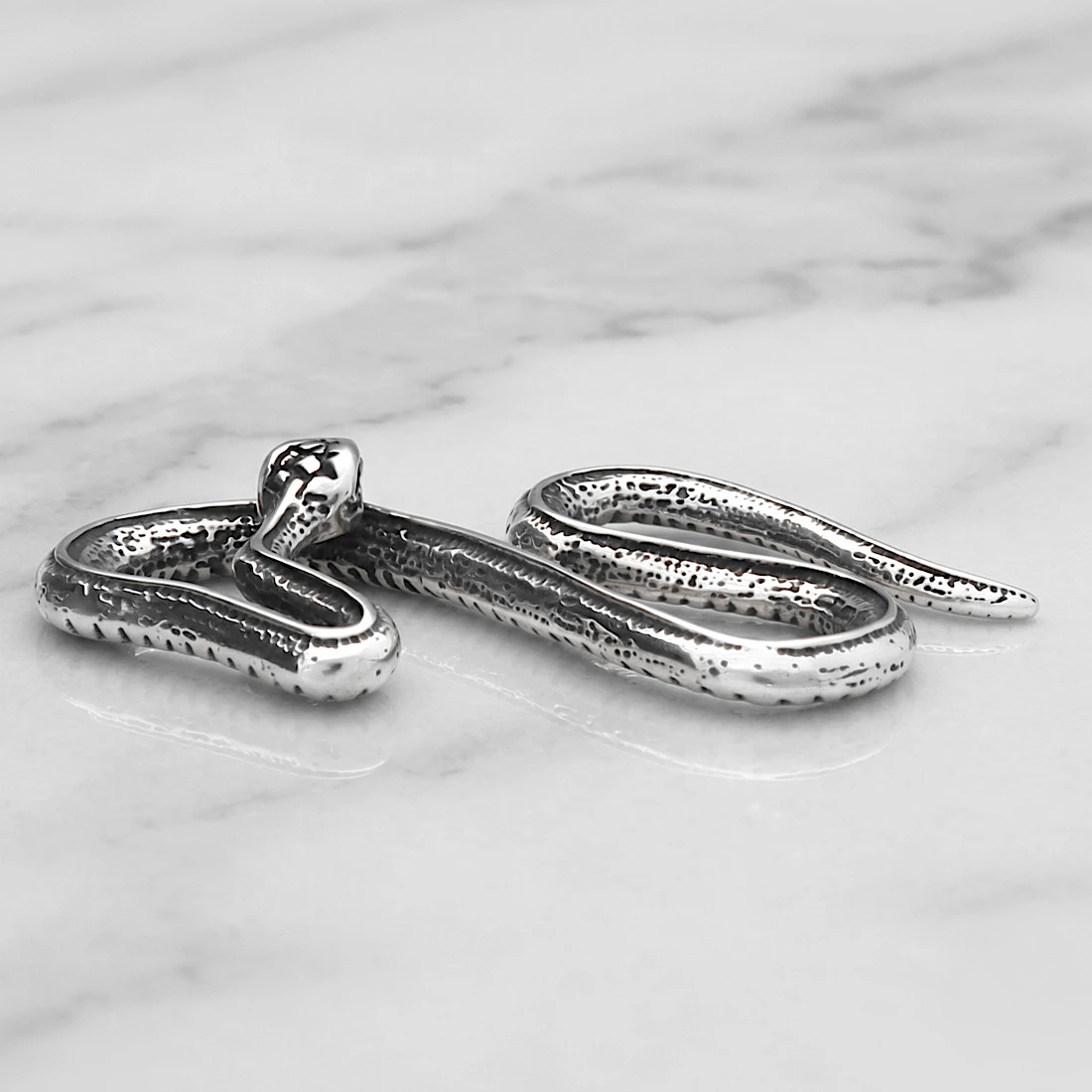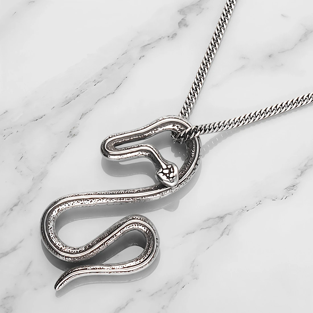 Wisiorek ma postać precyzyjnie odwzorowanego, wijącego się węża o smukłym ciele i wyraźnie zaznaczonej głowie z drobnymi nacięciami imitującymi oczy i usta. Oryginalna, asymetryczna forma opiera się na finezyjnym splocie, w którym ciało węża krzyżuje się ze sobą w górnej części, tworząc naturalną pętlę służącą do zawieszenia na łańcuszku lub rzemyku. Taki sposób mocowania eliminuje potrzebę stosowania dodatkowej krawatki, co podkreśla spójny design całego projektu. Powierzchnia wisiorka jest zdobiona subtelnymi, ciemniejszymi wgłębieniami, które imitują łuski węża, co nadaje mu autentyczności i charakteru. Solidna konstrukcja i dbałość o detale sprawiają, że wisiorek jest solidny i estetyczny.