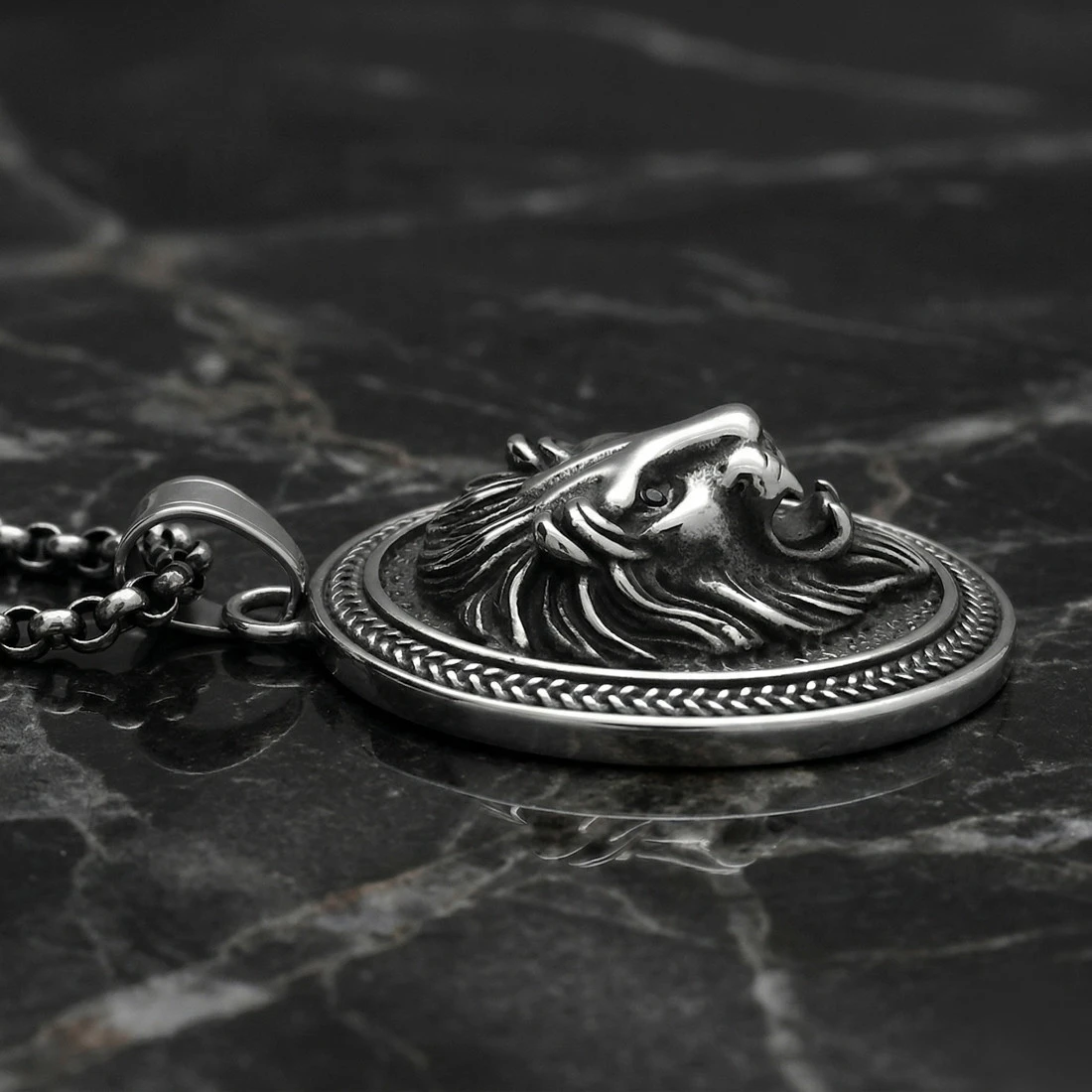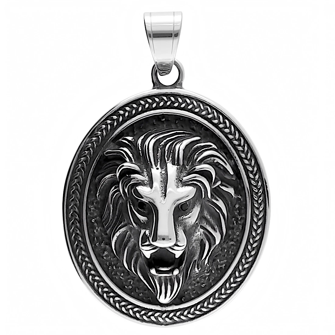 Głównym elementem zdobniczym jest trójwymiarowa, szczegółowo odwzorowana głowa lwa umieszczona w centrum medalionu. Tło wewnątrz owalu posiada ziarnistą fakturę i zostało poddane procesowi oksydowania, co tworzy ciemny kontrast dla wypukłych, polerowanych detali grzywy i pyska. Całość okala dekoracyjna ramka z wytłoczonym wzorem przypominającym splot kłosowy lub warkocz. Zewnętrzna krawędź zawieszki jest gładka i wykończona na wysoki połysk. Przedmiot wyposażono w szeroki krawat o prostym kształcie, który umożliwia zawieszenie na łańcuchach o różnej grubości.
