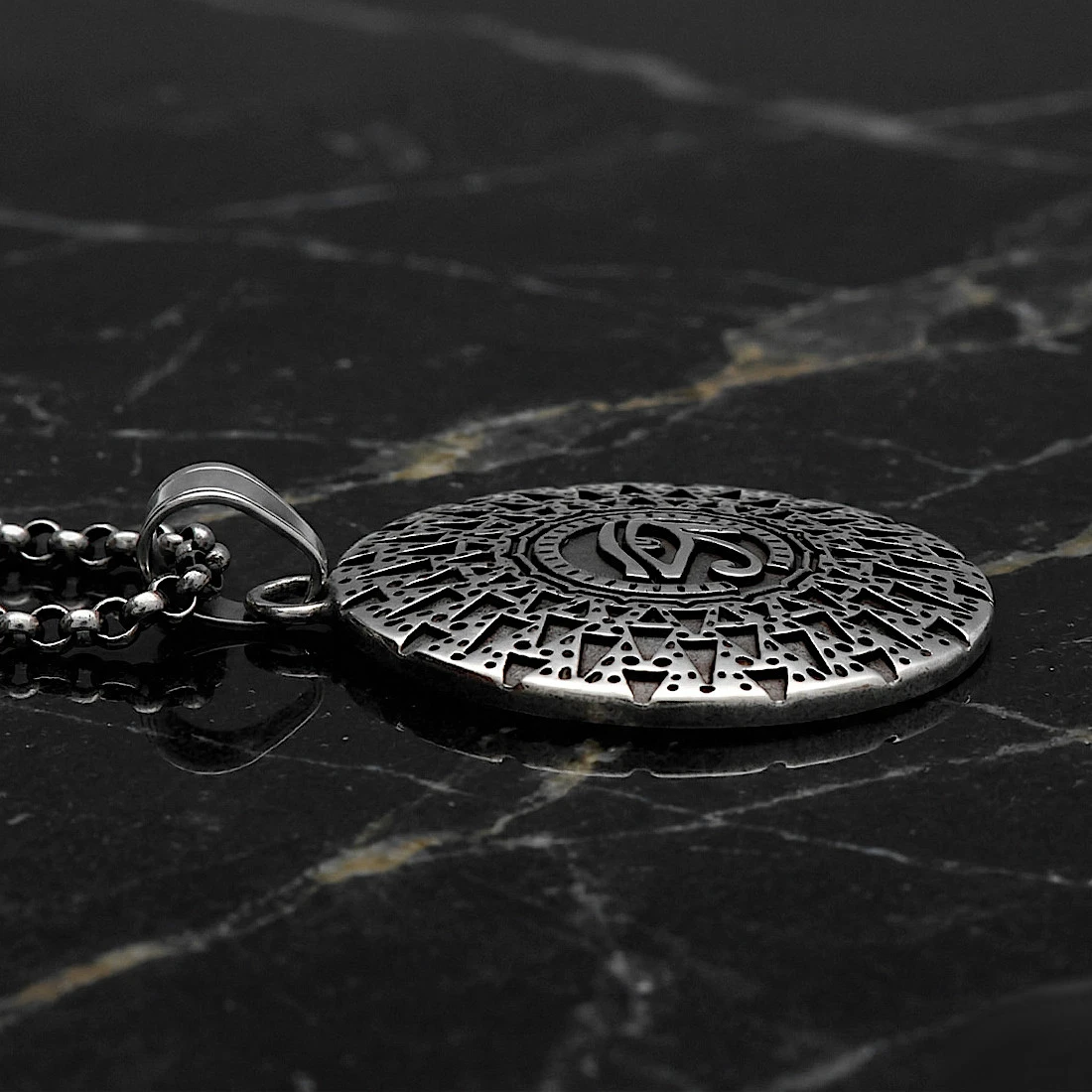 Centralnym punktem medalionu jest wypukły symbol Oka Horusa, umieszczony w wewnętrznym kręgu. Oko Horusa to starożytny egipski symbol ochronny. Składa się z oka z zaznaczoną brwią, spiralną linią pod okiem. Tło wokół symbolu oraz wgłębienia w geometrycznym wzorze zostały poddane procesowi oksydowania, co nadaje im ciemny, kontrastujący kolor i podkreśla trójwymiarowość zdobienia. Zewnętrzna część zawieszki jest wypełniona gęstym motywem trójkątów i drobnych punktów, które układają się w promienistą strukturę. Brzegi produktu są precyzyjnie wykończone, a gładka, wypolerowana krawędź domyka kompozycję. Całość zawieszono na ruchomym, klasycznym krawatce o polerowanej powierzchni.