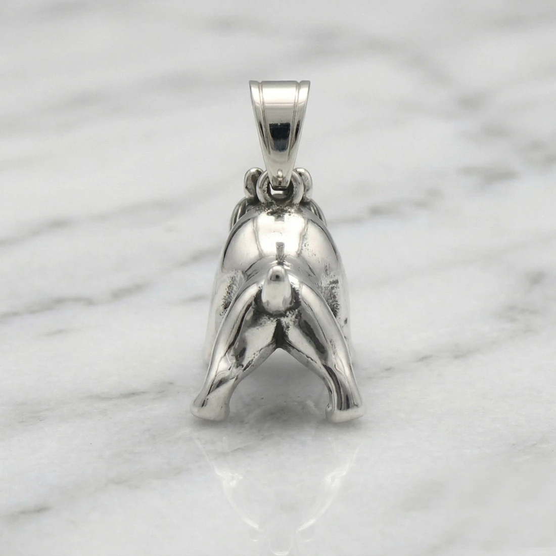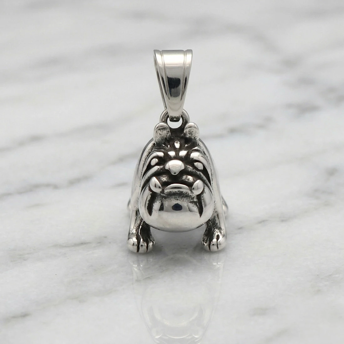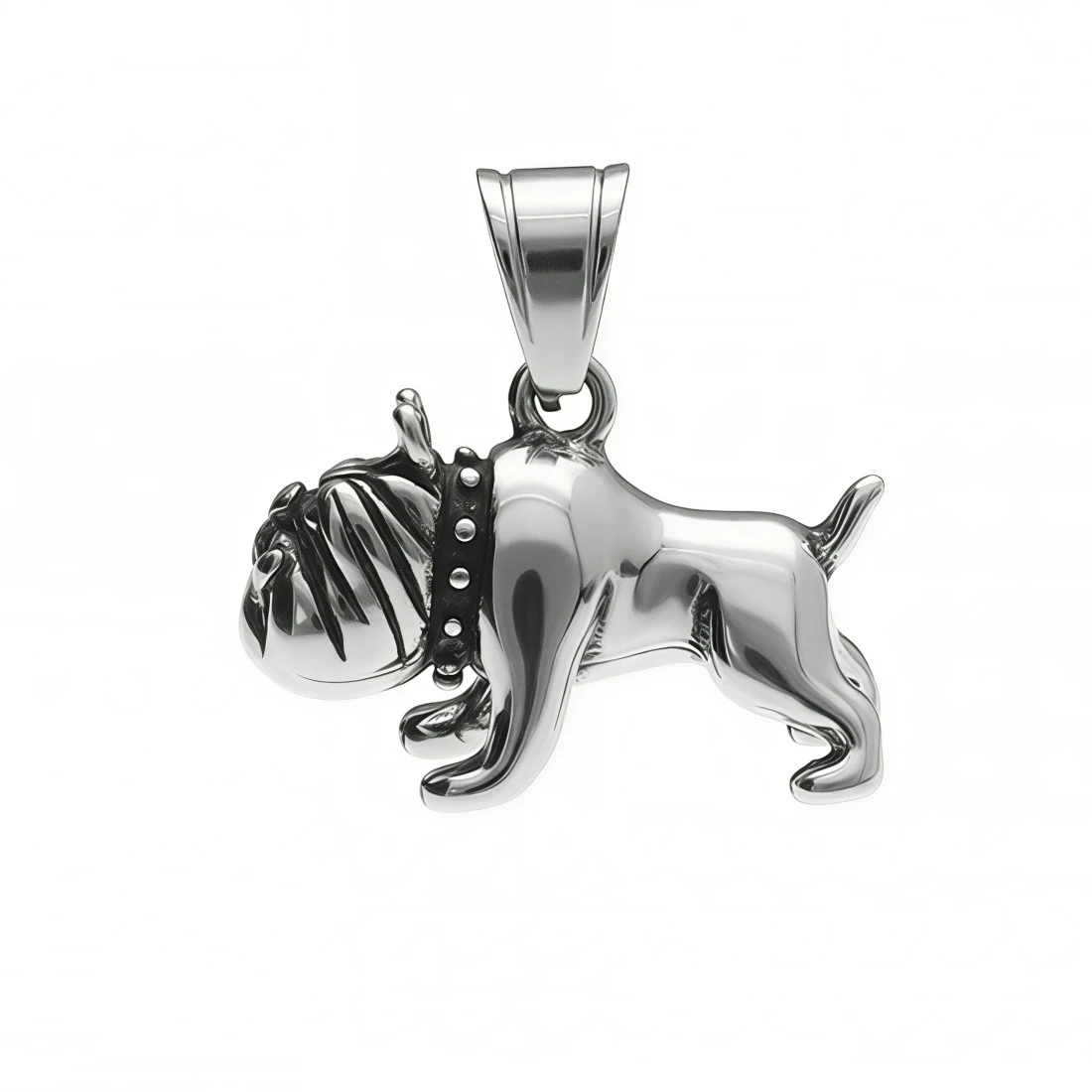 Wyrób przedstawia pełną, trójwymiarową sylwetkę buldoga francuskiego. Precyzyjne wykończenie oddaje charakterystyczne cechy rasy, w tym liczne fałdy skóry na głowie, stojące uszy oraz krępą budowę ciała. Dodatkowym elementem dekoracyjnym jest obroża z widocznymi wypustkami, wykończona oksydowaniem dla uzyskania ciemniejszego kontrastu. Górna część zawieszki posiada solidny, ruchomy krawat, umożliwiający swobodne zawieszenie na łańcuszku.
