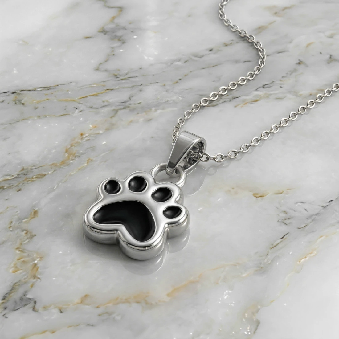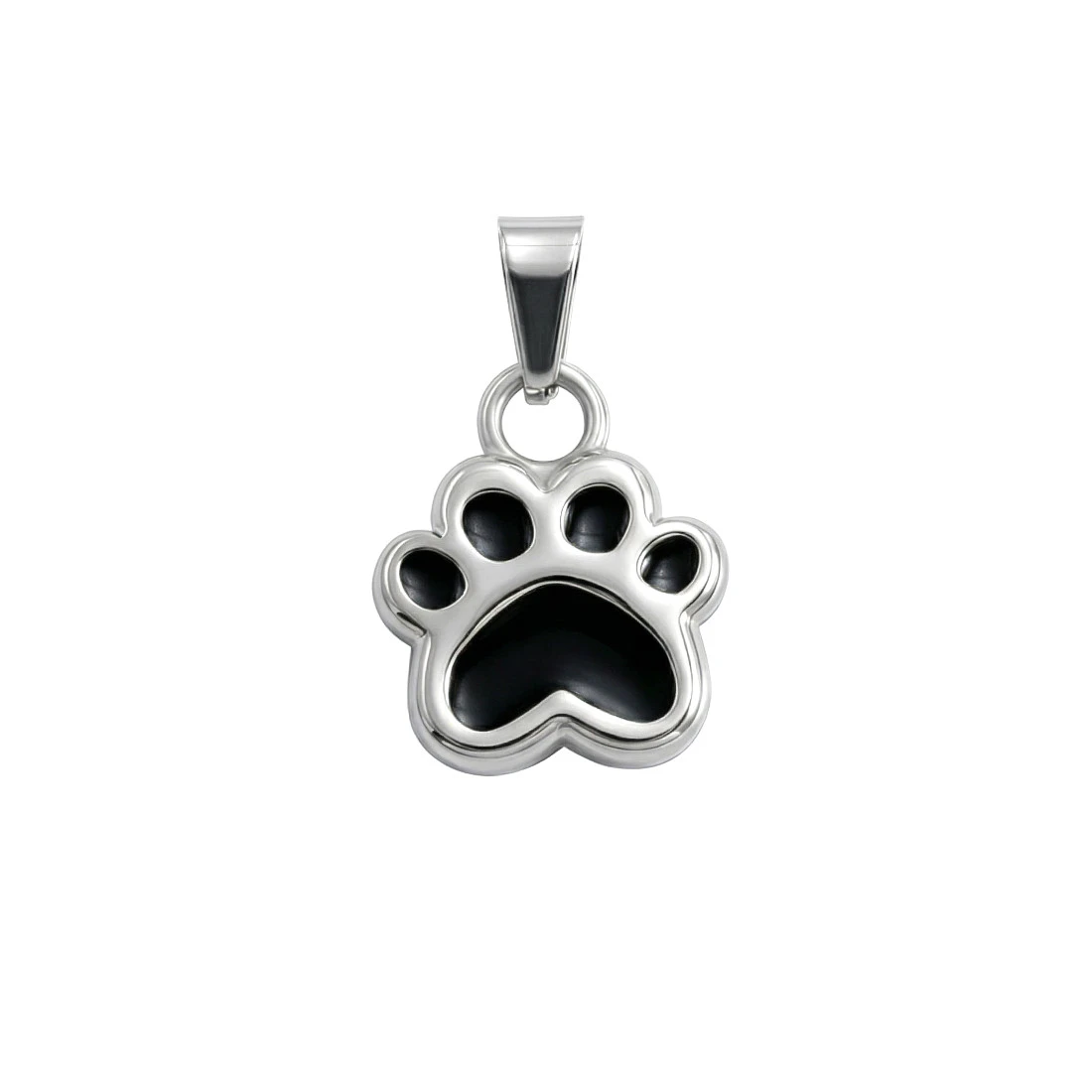 Srebrna mała zawieszka ze stali szlachetnej. Głównym motywem jest odcisk łapy zwierzęcia, prawdopodobnie psa lub kota. Kształt łapy jest wyraźnie zarysowany, z widocznymi palcami i poduszkami. Poduszki łapy są wypełnione czarną emalią, co tworzy kontrast z resztą zawieszki.