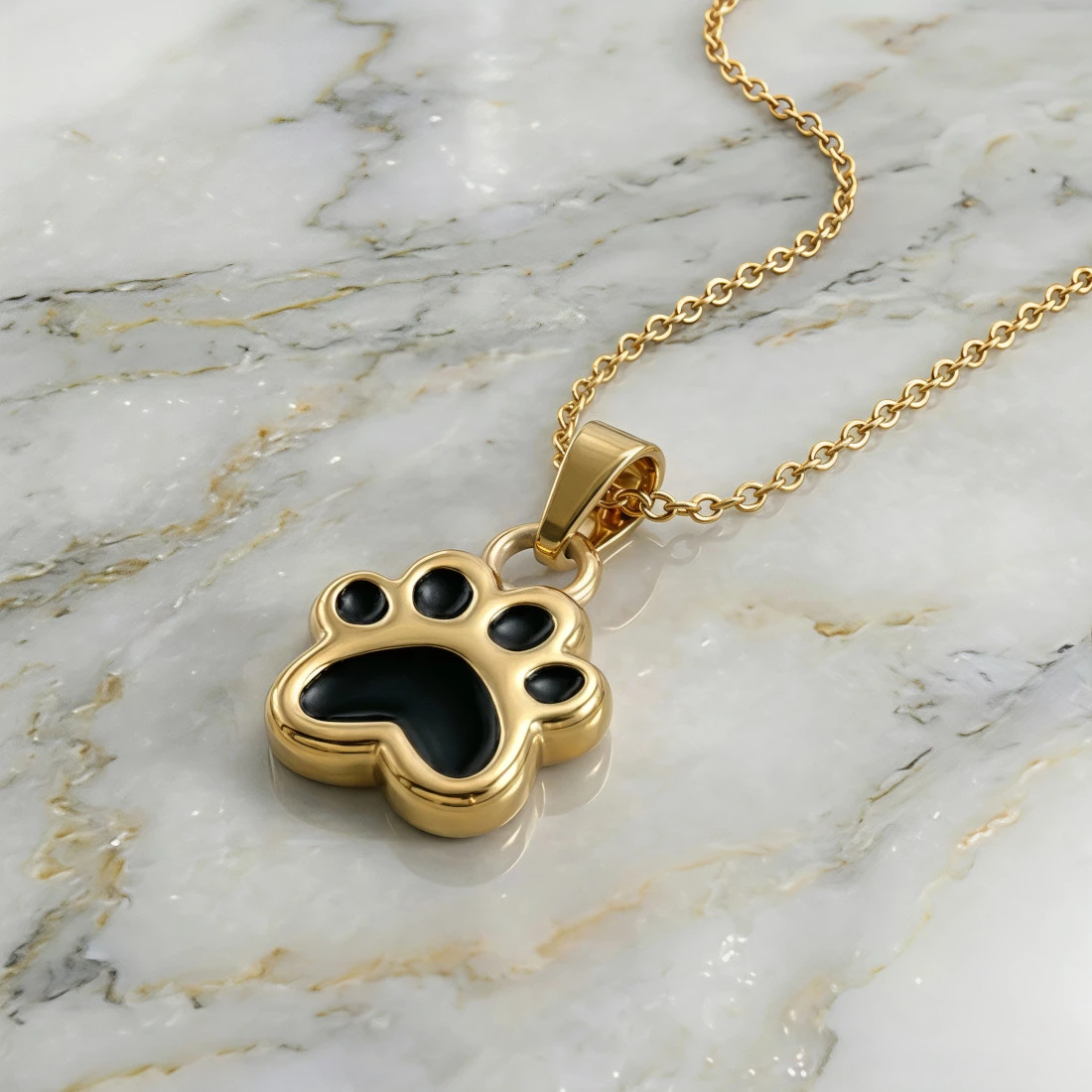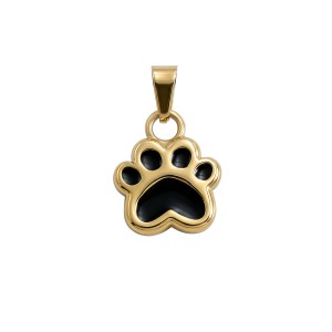 Głównym motywem jest odcisk łapy zwierzęcia, prawdopodobnie psa lub kota. Kształt łapy jest wyraźnie zarysowany, z widocznymi palcami i poduszkami. Poduszki łapy są wypełnione czarną emalią, co tworzy kontrast z resztą zawieszki.