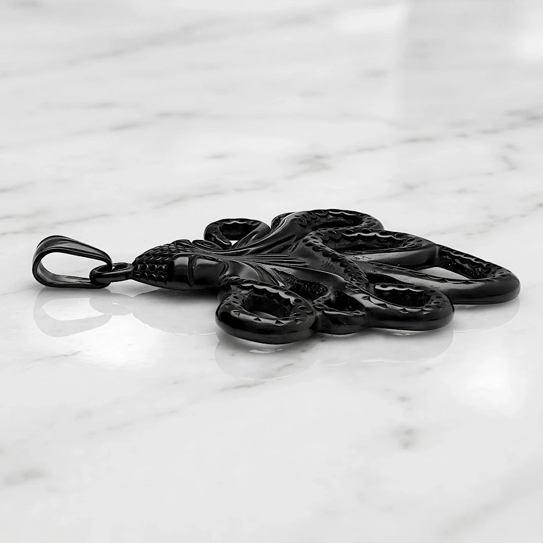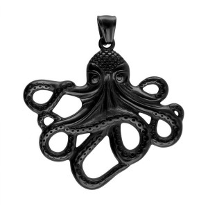 Produkt przedstawia szczegółowo odwzorowaną sylwetkę ośmiornicy z ośmioma wijącymi się ramionami. Powierzchnia macek została wykończona wyraźną fakturą imitującą przyssawki, co nadaje ozdobie trójwymiarowości. Głowa zwierzęcia posiada drobne, regularne tłoczenia oraz wyraźnie zaznaczone otwory oczne. Całość została poddana procesowi polerowania na wysoki połysk, co w połączeniu z czarną powłoką PVD tworzy efektowne refleksy świetlne. Górna część zwieńczona jest klasyczną, szeroką krawatką, która umożliwia zawieszenie ozdoby na grubym łańcuchu lub rzemieniu.