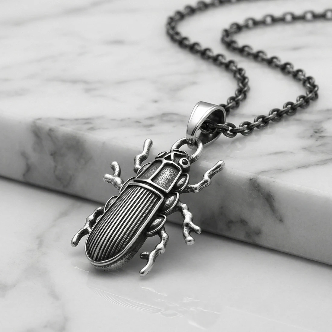 Zawieszka ma formę realistycznie przedstawionego chrząszcza skarabeusza. Kształt owada jest wyraźnie zarysowany, z zaznaczonymi segmentami ciała i odnóżami. Jego głowa ma oczy i czułki, a skorupa wyraźne podziały i prążki, imitujące naturalną strukturę.