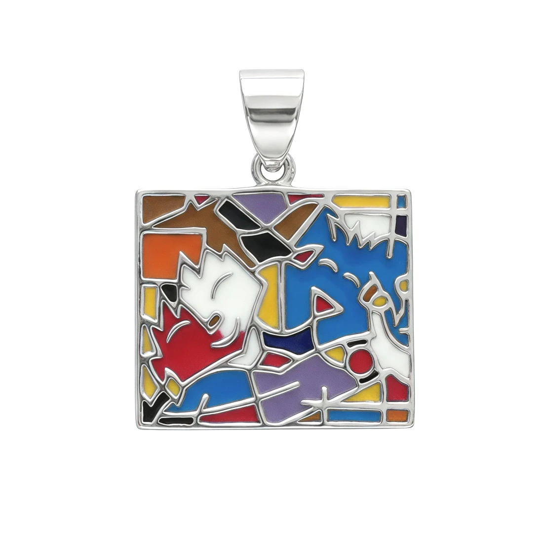 Przedmiot ma kształt regularnego prostokąta, którego front wypełnia wielobarwna kompozycja wykonana techniką emaliowania. Wzór przedstawia stylizowane, zwrócone ku sobie sylwetki chłopca oraz psa, wpisane w gęstą sieć geometrycznych podziałów. W kompozycji wykorzystano kontrastujące barwy: niebieski, czerwony, biały, żółty, fioletowy oraz brązowy. Każde pole kolorystyczne jest precyzyjnie oddzielone stalowym konturem, co nadaje całości wygląd klasycznego witrażu. Zawieszka jest zwieńczona solidnym, polerowanym uchem o ergonomicznym kształcie.
