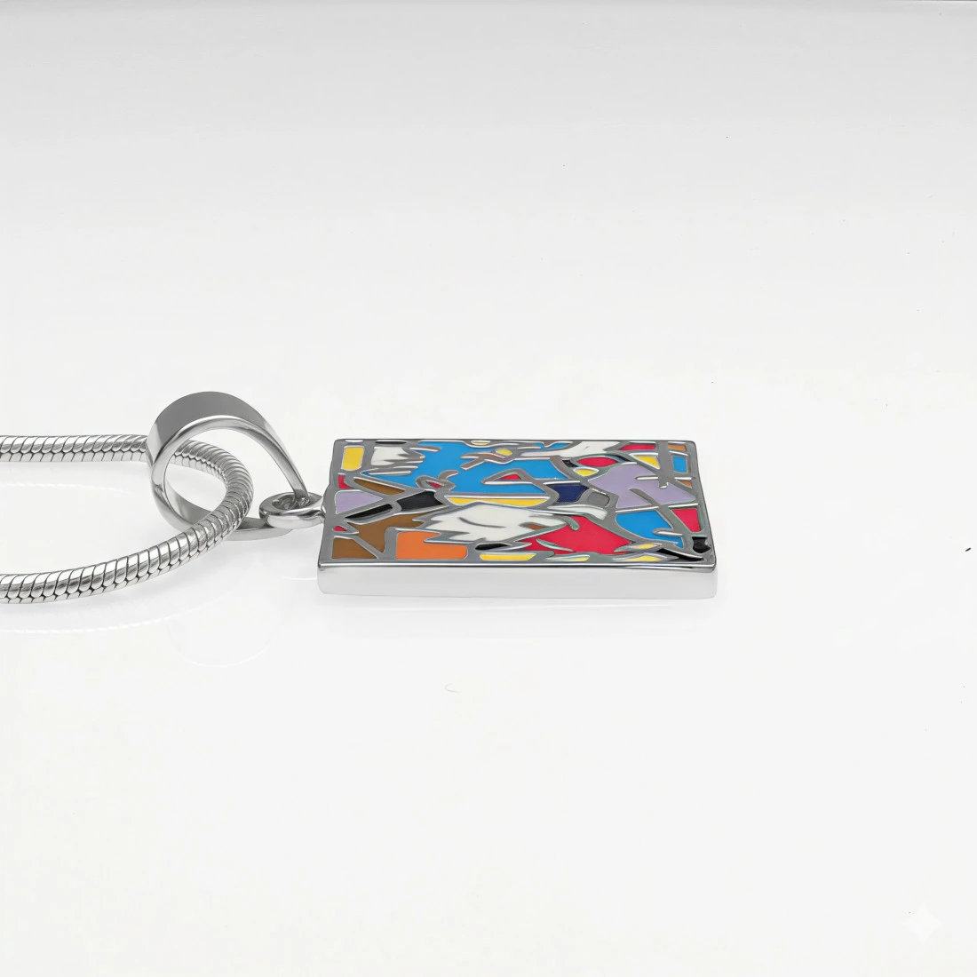 Zawieszka wykonana ze stali szlachetnej o lustrzanym wykończeniu. Materiał ten jest ceniony za wyjątkową trwałość, odporność na zarysowania oraz fakt, że nie ulega procesom utleniania ani ciemnienia. Dzięki właściwościom hipoalergicznym stal szlachetna jest bezpieczna dla osób o wrażliwej skórze, stanowiąc trwałą i praktyczną bazę dla kolorowych zdobień. Gładka powierzchnia ramki i zapięcia podkreśla nowoczesny charakter przedmiotu.