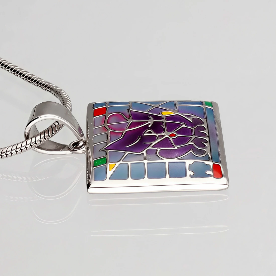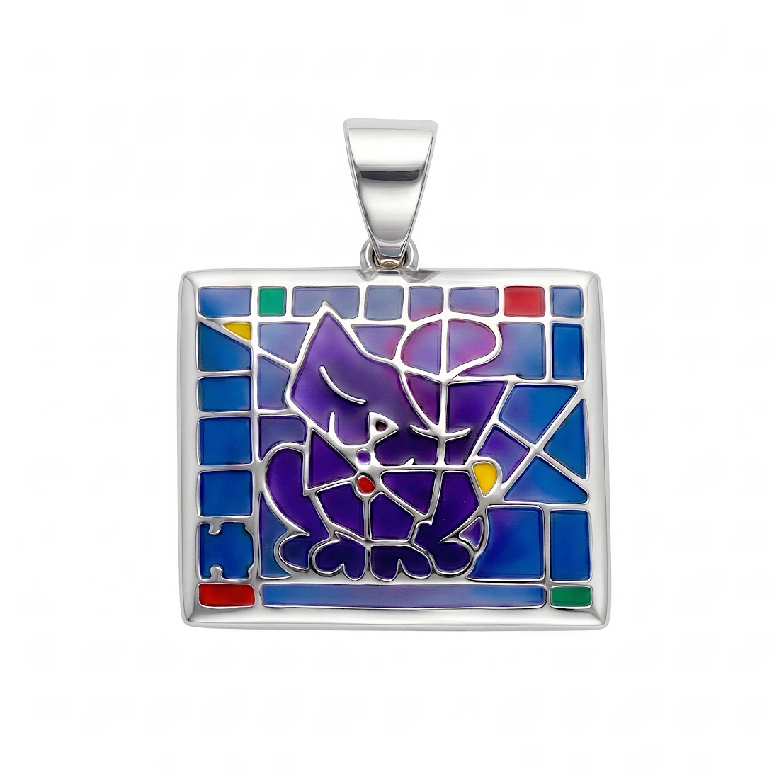 Przedmiot ma formę regularnego kwadratu z lekko zaokrąglonymi krawędziami. Wnętrze ramki wypełnia kompozycja przypominająca witraż, wykonana techniką emaliowania. Centralnym punktem wzoru jest stylizowana sylwetka siedzącego kota w kolorze fioletowym, otoczona geometrycznym podziałem pól. Zastosowano szeroką paletę barw, w tym różne odcienie niebieskiego, fioletu oraz punktowe akcenty czerwieni, zieleni i żółci. Poszczególne sekcje kolorystyczne są oddzielone stalowymi liniami, które tworzą wyraźny kontur wzoru. Całość zawieszona jest na klasycznym, gładkim krawatkowym zapięciu o trójkątnym profilu.