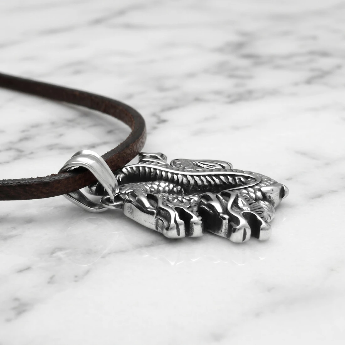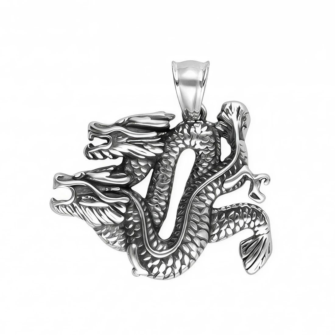 Przedmiot przedstawia dwie splecione sylwetki smoków, wykonane z dbałością o detale. Na powierzchni wyraźnie zaznaczono strukturę łusek, płetwy oraz charakterystyczne rysy głów mitologicznych stworzeń. Detale zostały podkreślone metodą oksydowania w zagłębieniach, co nadaje całości efekt trójwymiarowości i wydobywa precyzję zdobień. Górna część produktu wyposażona jest w szerokie, gładkie ucho pozwalające na zawieszenie na łańcuszku o różnej grubości lub rzemieniu.