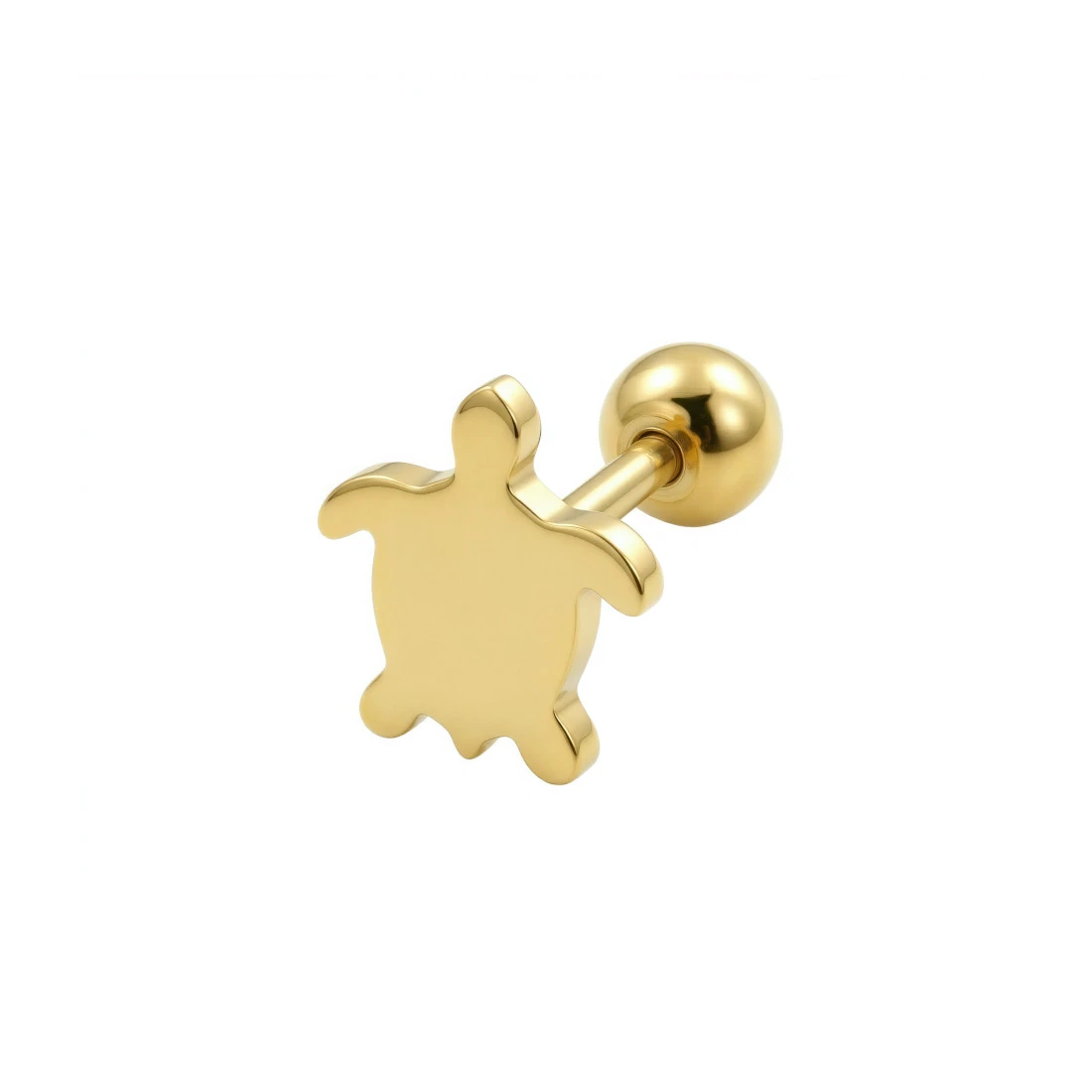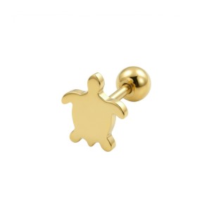 Ozdobny złoty kolczyk, mała sztanga z gwintem zewnętrznym z jednej strony. Wykonana ze Stali Chirurgicznej 316L, materiału przyjaznego dla skóry, trwałego, odpornego na korozję oraz łatwego w utrzymaniu czystości i higieny. Kolorowa powłoka uzyskana metodą PVD zapewniającą trwałość barwy i odporność na zarysowania. Kolczyk składa się z krótkiego pręcika, ozdobnej nieodkręcanej nakrętki w formie żółwia z przodu i odkręcanego dysku z tyłu.