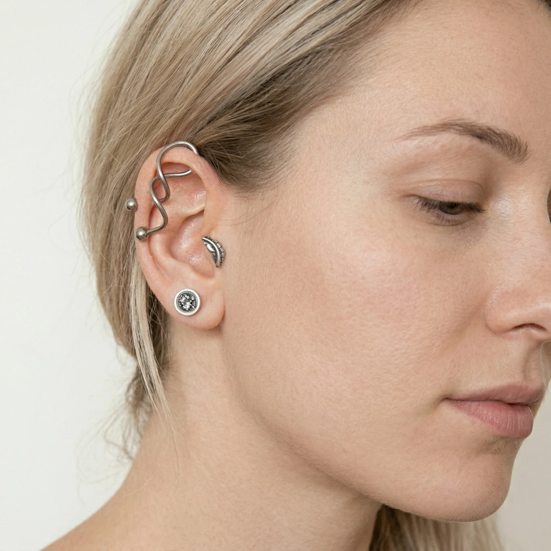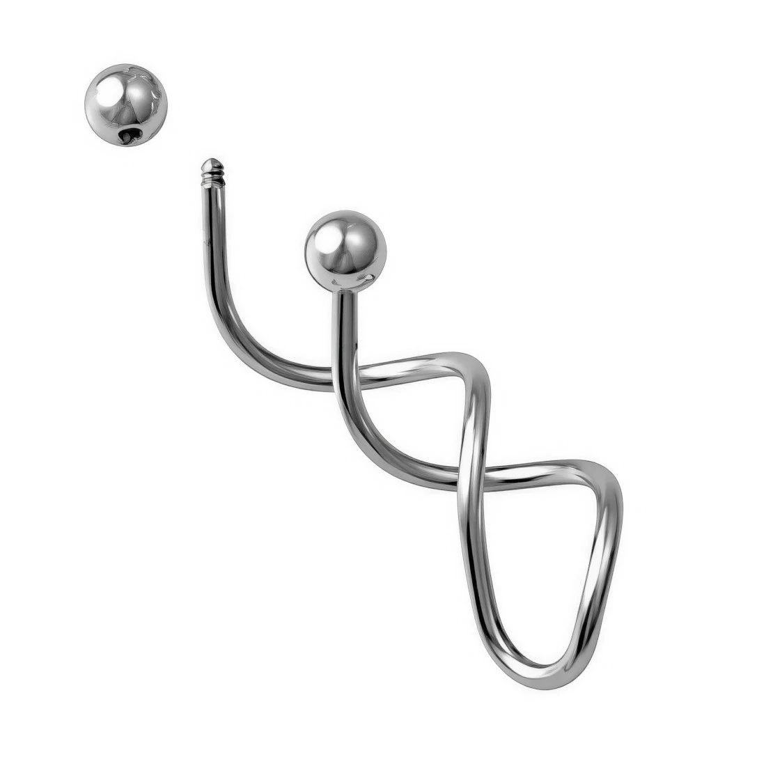 Konstrukcja kolczyka opiera się na fantazyjnie skręconym pręcie, który tworzy efektowną spiralę wokół krawędzi ucha. Biżuteria posiada gwint zewnętrzny, na który nakręcane są dwie klasyczne, gładkie kulki o lustrzanym wykończeniu. Całość jest starannie wypolerowana, co zapewnia gładkość powierzchni i komfort podczas przekładania przez kanał wkłucia. Precyzyjne skręcenie spirali zostało zaprojektowane tak, aby stabilnie układało się na małżowinie usznej.