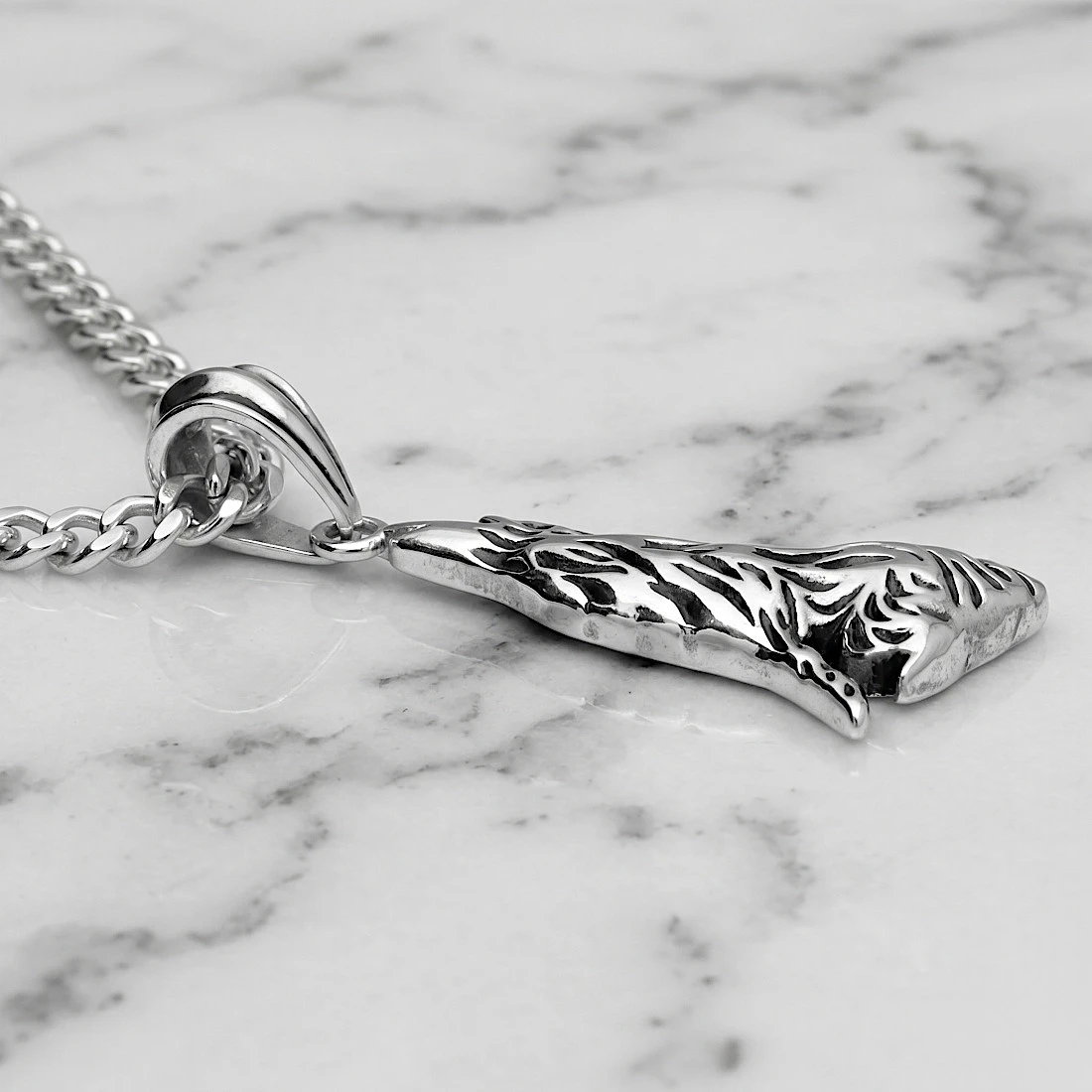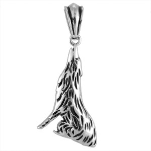 Produkt przedstawia sylwetkę wilka w charakterystycznej pozie z uniesioną głową. Detale anatomiczne, takie jak faktura sierści, zostały podkreślone za pomocą precyzyjnych żłobień wypełnionych czarną oksydą. Kontrast między jasnym, polerowanym metalem a ciemnymi wcięciami nadaje ozdobie głębię i uwypukla trójwymiarowość rzeźbienia. Górna część zwieńczona jest solidnym, podłużnym uszkiem, które pozwala na zawieszenie wisiora na łańcuszku o różnym splocie lub na rzemieniu.
