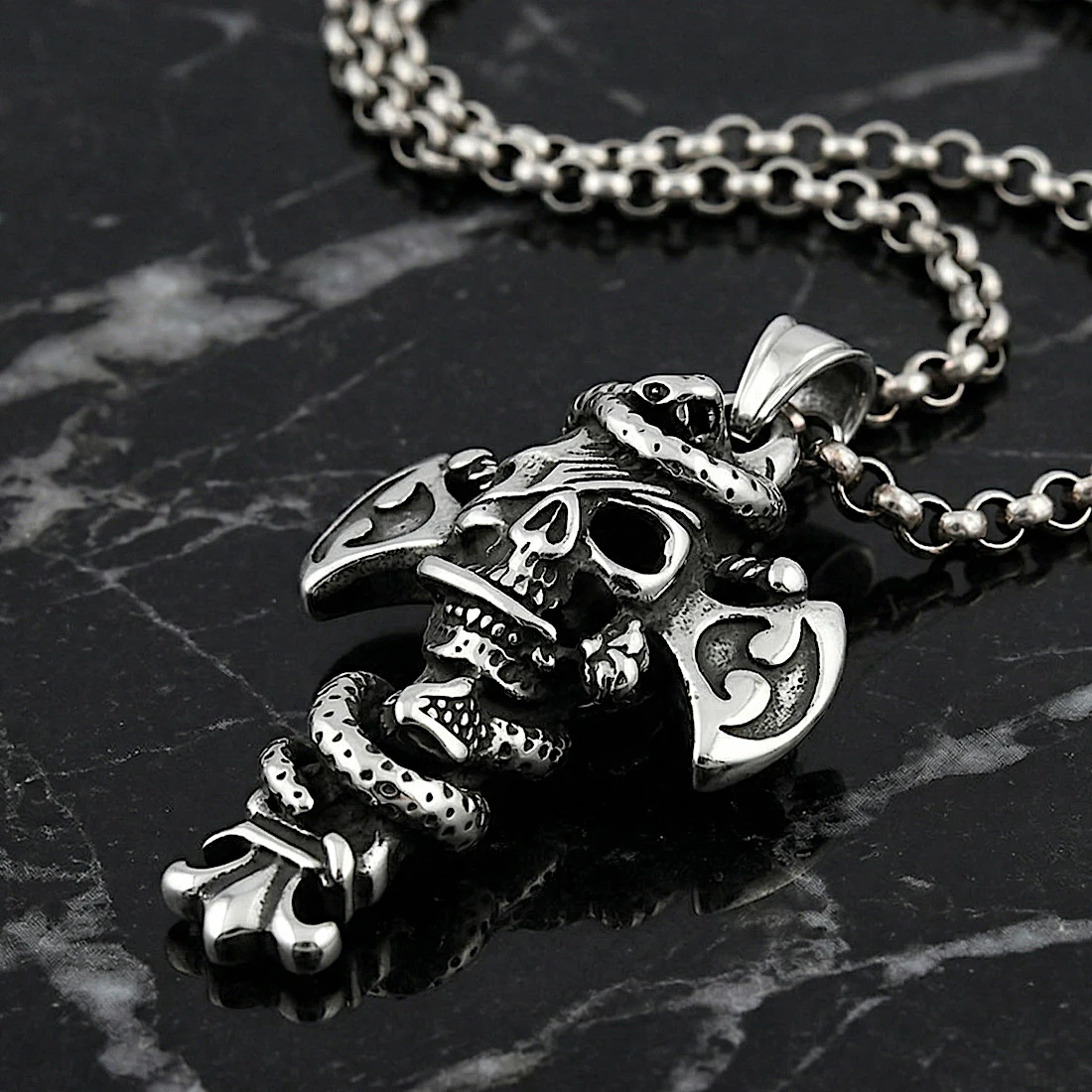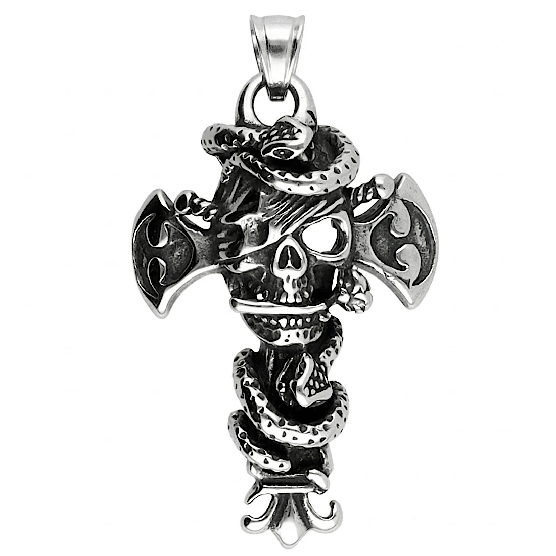 Konstrukcja zawieszki opiera się na formie krzyża o ozdobnych, rozszerzanych ramionach z wytłoczonymi motywami dekoracyjnymi. W centralnym punkcie umieszczono trójwymiarową czaszkę z opaską na oku, która jest opleciona przez realistycznie odwzorowanego węża. Detale, takie jak łuski gada czy krawędzie krzyża, zostały podkreślone metodą oksydowania, co nadaje całości głębi i uwydatnia kontrast między polerowaną stalą a ciemniejszymi wgłębieniami. Górna część produktu jest zakończona solidnym, szerokim uchem pozwalającym na zawieszenie biżuterii na grubym łańcuchu lub rzemieniu.