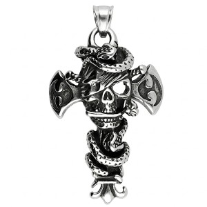 Zawieszka stalowa KRZYŻ Z CZASZKĄ I WĘŻEM - srebrna