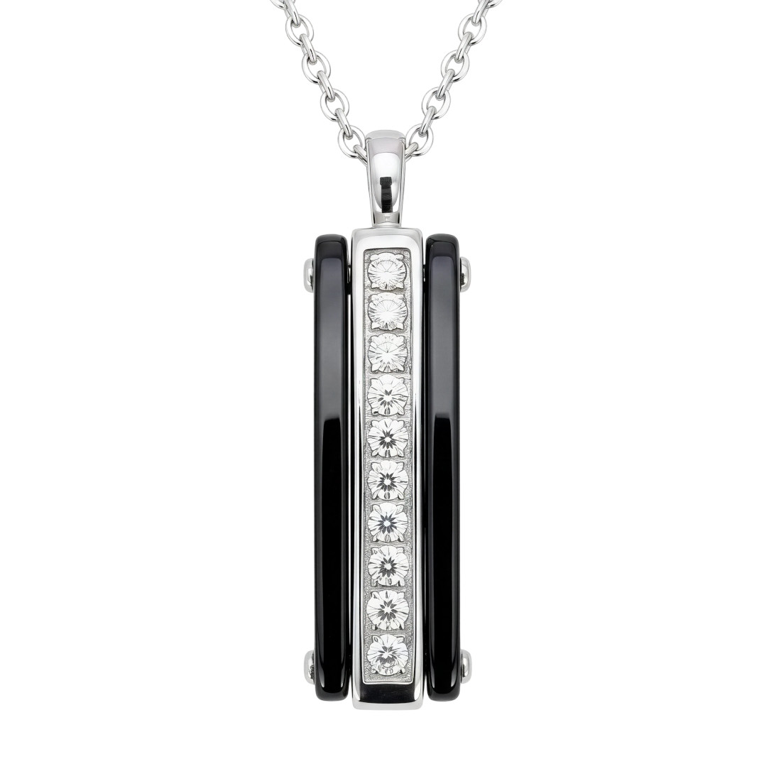 Centralnym punktem kompozycji jest podłużny panel wysadzany rzędem lśniących cyrkonii, które efektownie kontrastują z gładkimi, ceramicznymi bokami o lustrzanym wykończeniu. Całość oprawiona jest w srebrzysty metal i zawieszona na klasycznym, subtelnym łańcuszku o splocie typu ankier, co nadaje biżuterii ponadczasowego charakteru.