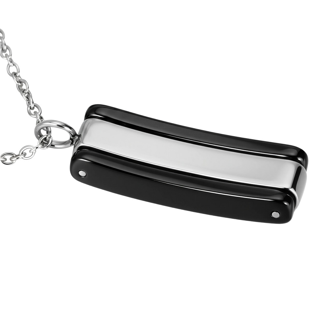 Ten elegancki wisiorek to kwintesencja nowoczesnego designu, łącząca w sobie surowość stali szlachetnej z głębokim połyskiem czarnej ceramiki.